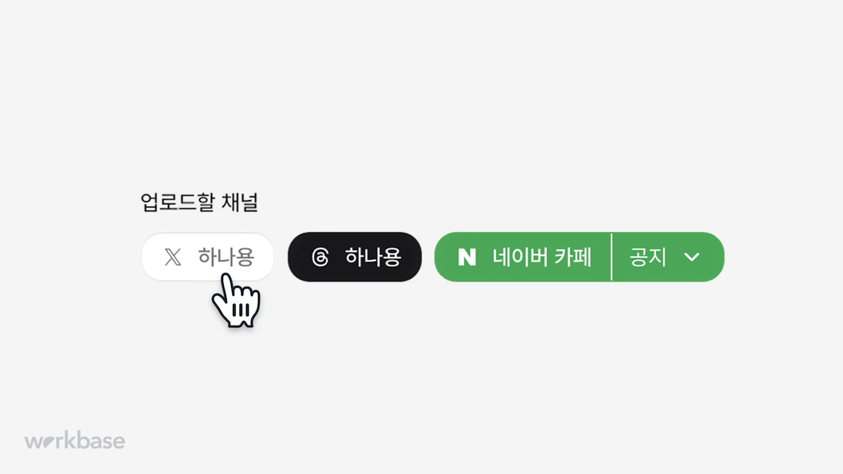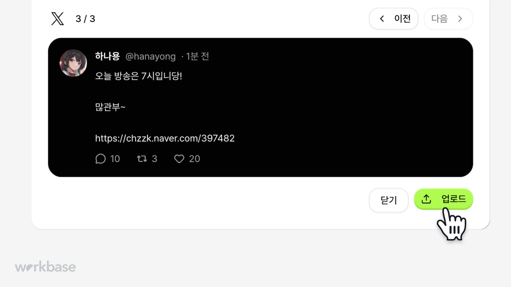 꾸준한 방송 공지는 평균적으로 17% 더 많은 시청자를 끌어모을 수 있지만, 매번 여러 SNS 채널에 올리는 건 번거로운 일이죠. 워크베이스에서는 글은 한 번만 작성하고, 클릭 한 번으로 네이버 카페, X, Threads 3개 플랫폼에 모두 업로드할 수 있어요!