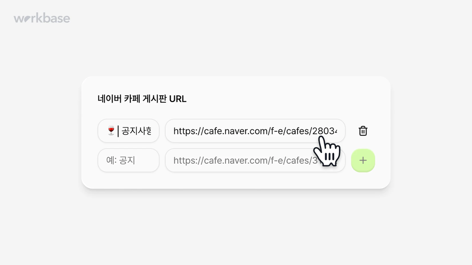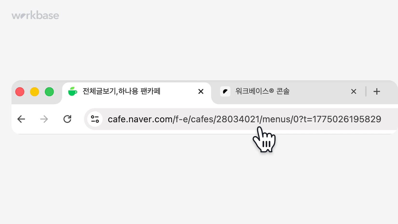 여기서 복사한 URL 링크를 워크베이스 콘솔 → 공지 작성 → 우측 상단의 '연동 설정'에서 네이버 카페 게시판의 URL 란에 붙여넣고, 게시판의 이름은 카페의 게시판명을 그대로 넣어주세요.