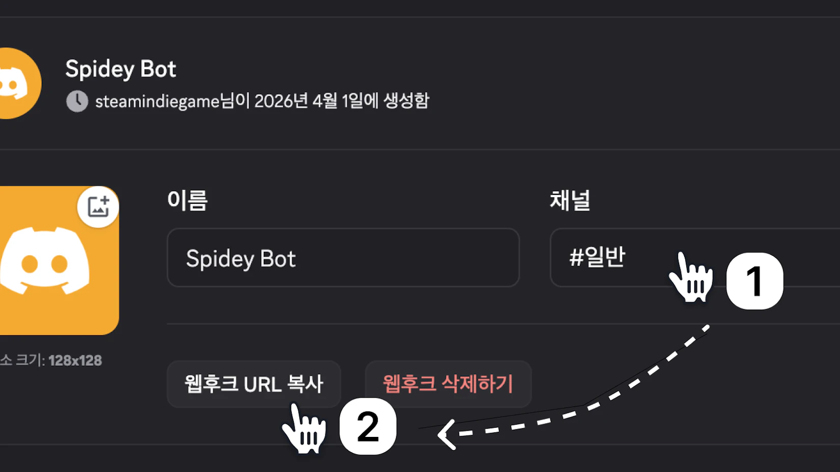 아래의 순서대로 서버 설정에서 웹후크를 추가한 후, URL을 복사해주세요!
