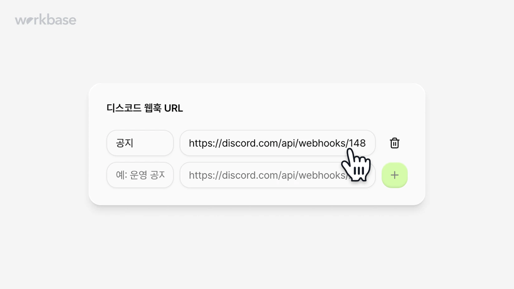 1단계에서 복사한 URL을 워크베이스 콘솔 → 공지 작성 → 우측 상단의 '연동 설정'에서 디스코드 웹훅 URL 란에 붙여넣고, 채널의 이름은 식별하기 쉽게 설정해주세요. 실제 채널의 이름과 같게 설정하면 편리해요.